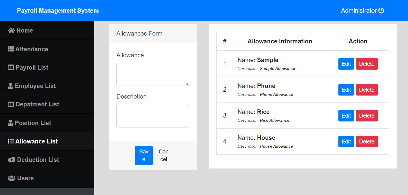 Payroll List, Employee List, Department List, Position List, Allowance List,